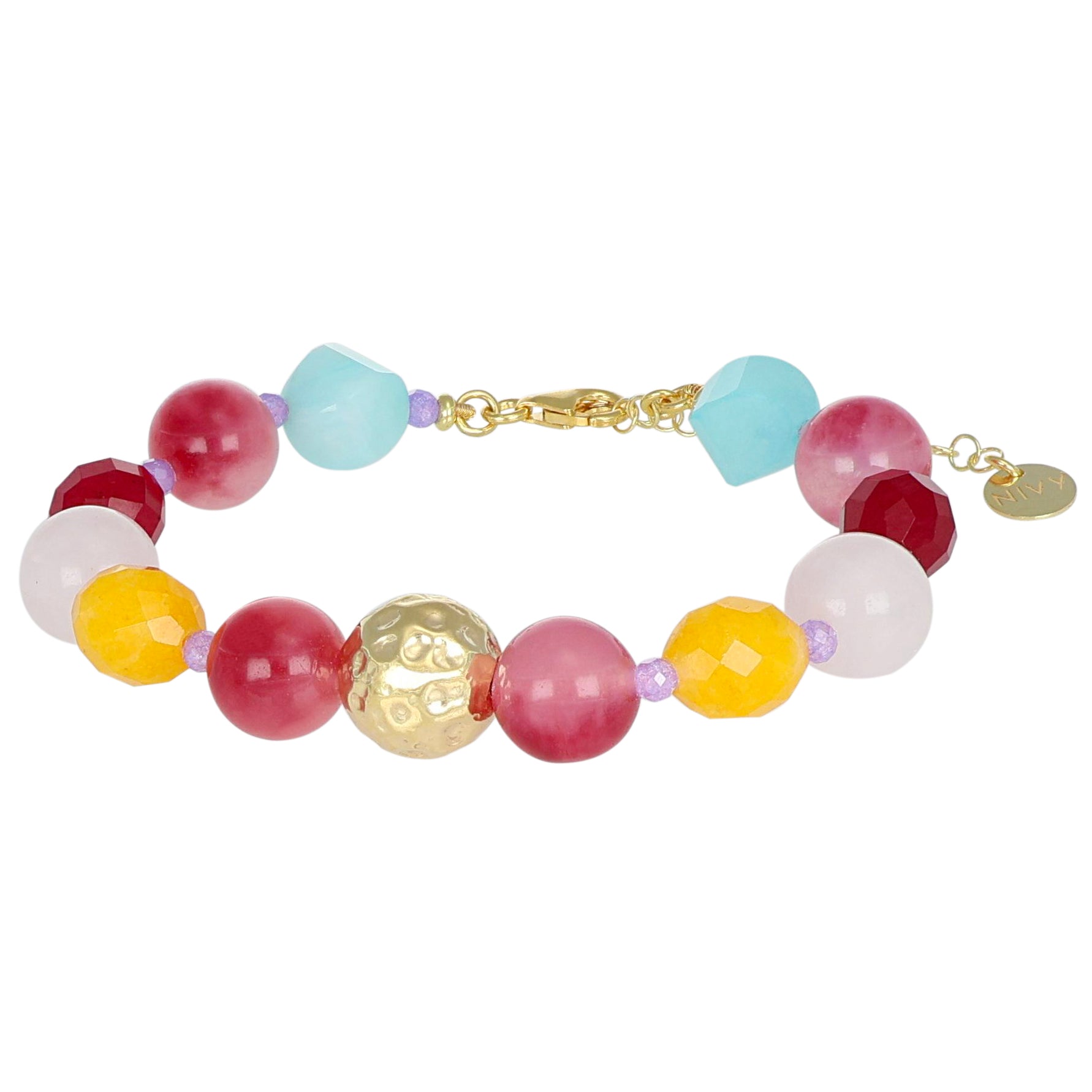 Questo bracciale in argento 925 dorato è un vero inno alla vivacità, caratterizzato da un mix eclettico di pietre naturali che creano un effetto "arcobaleno" sofisticato e solare. Il design si sviluppa attorno a un elemento centrale scultoreo: una grande sfera in argento dorato dalla finitura martellata, che funge da fulcro visivo e materico del gioiello.