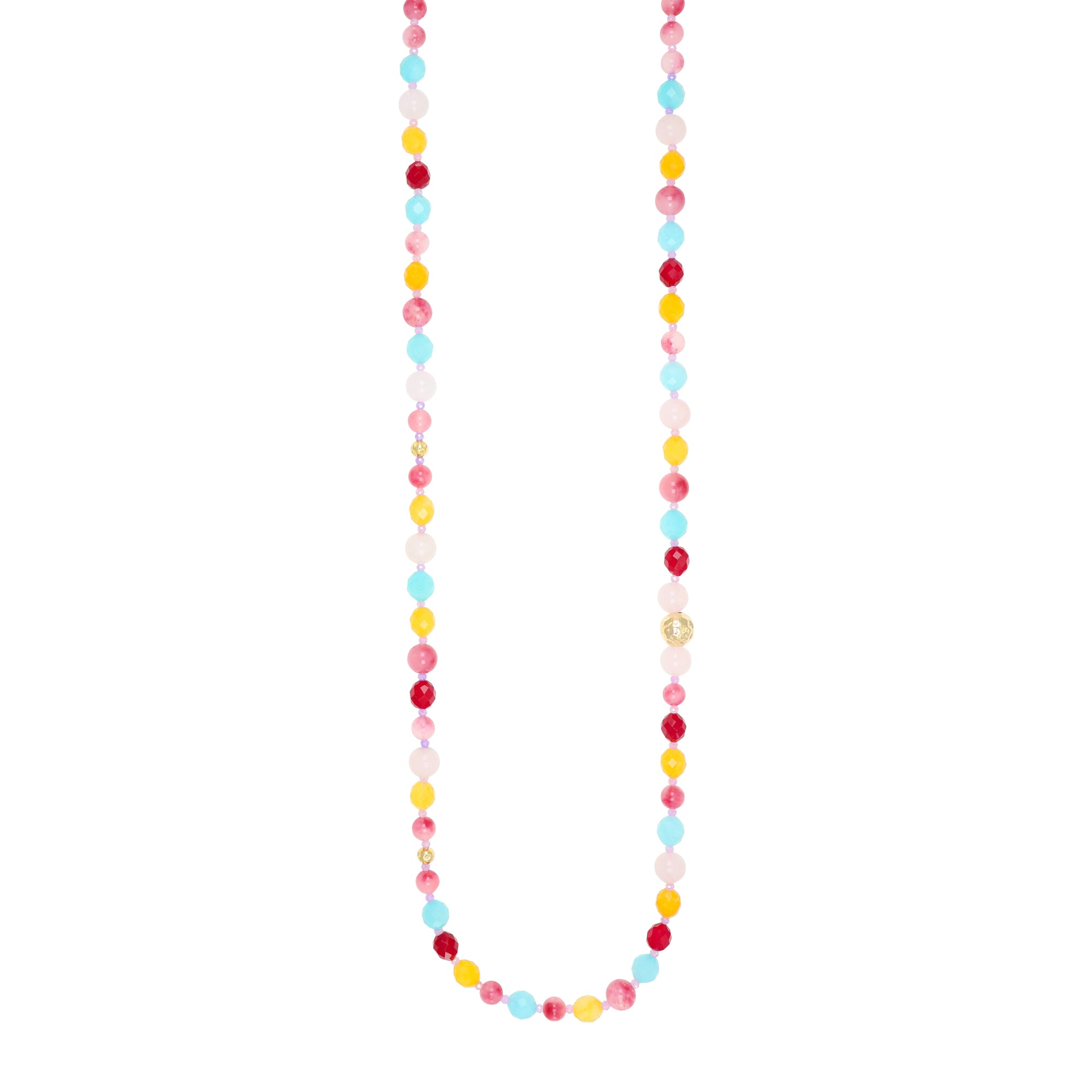 Il design è ritmato dall'inserimento di pietre dure  e piccoli zirconi che catturano la luce, creando bagliori continui lungo tutto il filo. Elementi sferici in argento dorato dalla finitura martellata impreziosiscono ulteriormente la struttura, aggiungendo un dettaglio artigianale e materico. Con una lunghezza di 75 cm, la collana scende morbida sul décolleté, offrendo un'eleganza gioiosa e versatile, ideale per completare outfit estivi o per dare un tocco di colore ai look quotidiani.