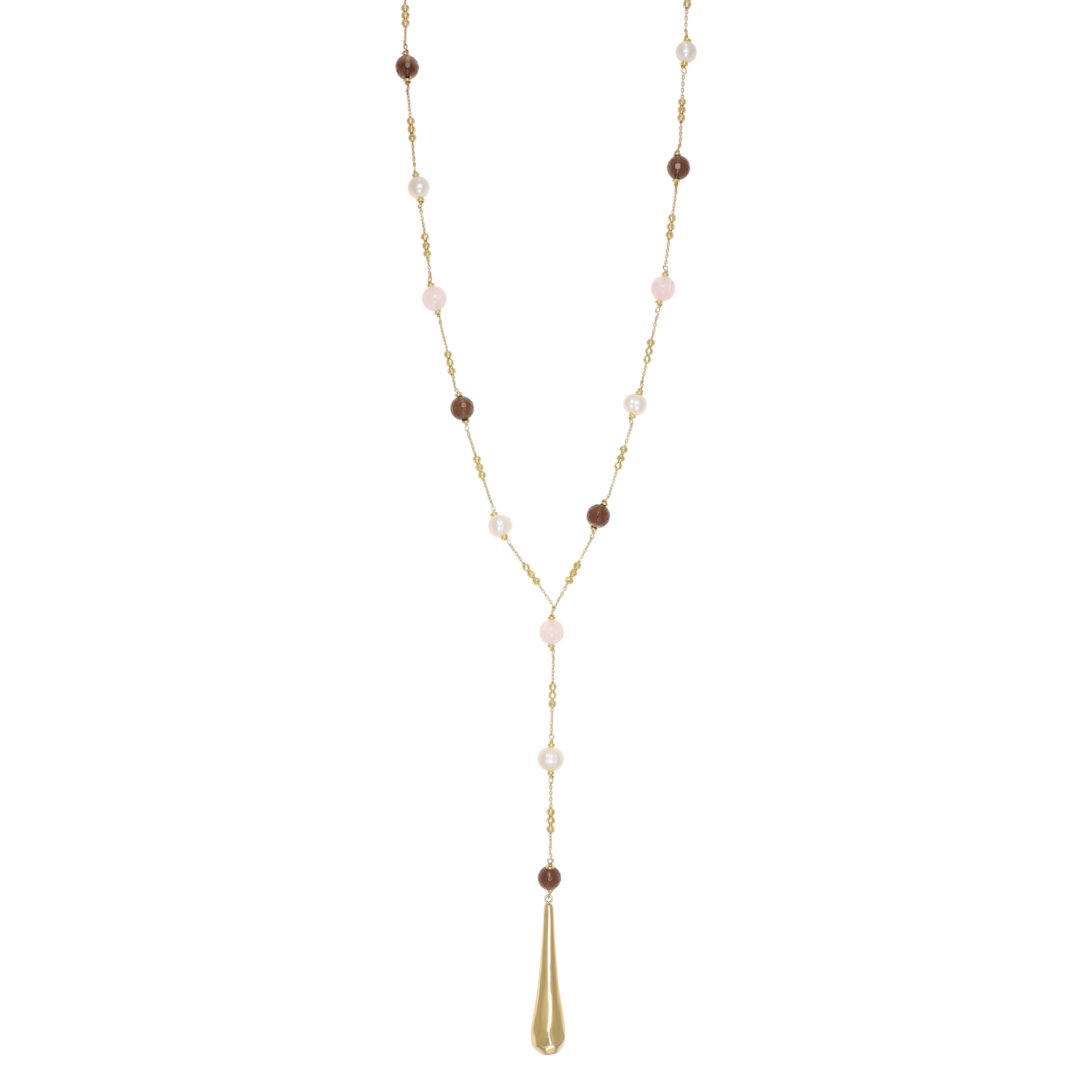 La combinazione del quarzo fumé sfaccettato, del quarzo rosa liscio e delle perle di fiume crea un mix di superfici e tonalità che cattura lo sguardo. I colori si fondono in una palette delicata e incisiva, capace di esaltare la tua bellezza naturale.