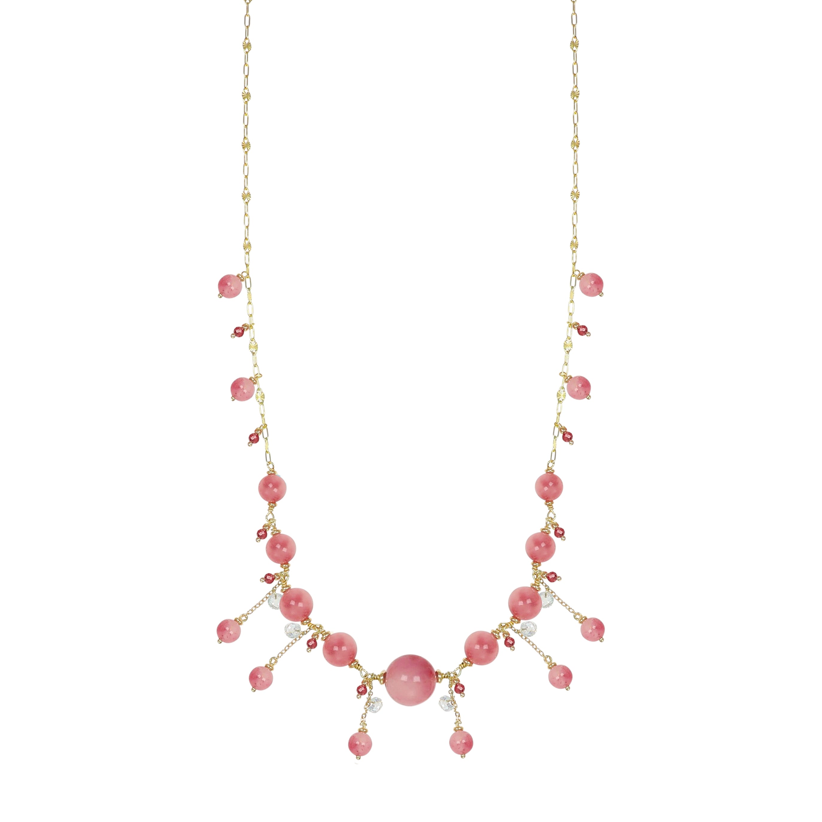 Raffinato e romantico, questo girocollo in argento 925 dorato incarna la delicata femminilità grazie al quarzo fragola. La struttura utilizza un design a cascata , con sfere di diverse dimensioni che scendono morbidamente lungo la catena dorata, creando un effetto visivo dinamico e prezioso.