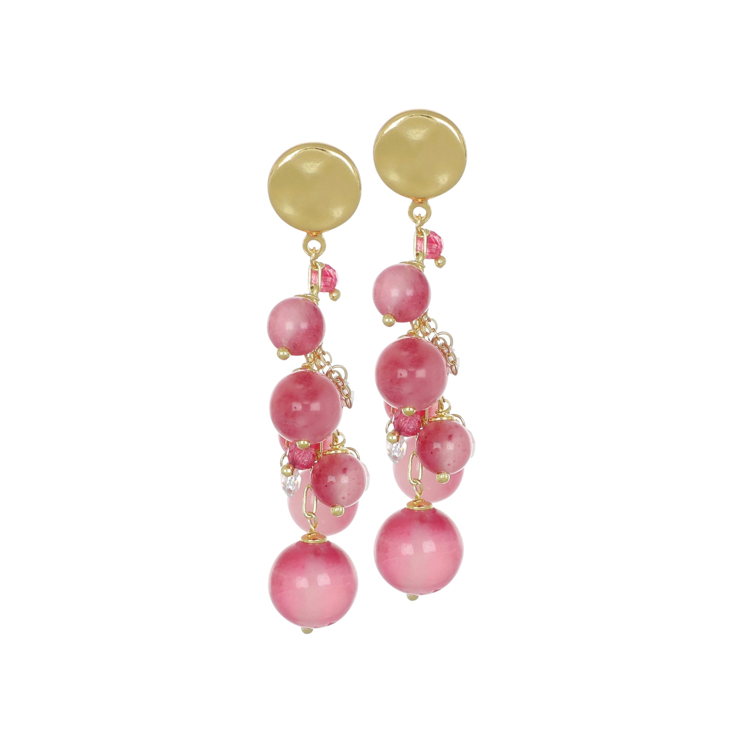 Questi orecchini pendenti in argento 925 dorato si distinguono per un design scenografico a cascata che celebra la delicatezza e il romanticismo delle tonalità rosate. Il gioiello è caratterizzato da un raffinato perno a lobo dalla forma circolare con finitura lucida che funge da punto luce dorato sul volto. Dalla base discende un dinamico grappolo di pietre in quarzo fragola di diverse dimensioni, disposte in modo armonioso per creare un effetto di volume leggero e sofisticato. La composizione è impreziosita da piccoli zirconi che donano profondità cromatica e bagliori preziosi a ogni movimento. Con una lunghezza di 5,5 cm, questi orecchini rappresentano un accessorio di grande femminilità, ideale per chi desidera valorizzare il proprio stile con un tocco di colore naturale e una brillantezza artigianale ricercata.