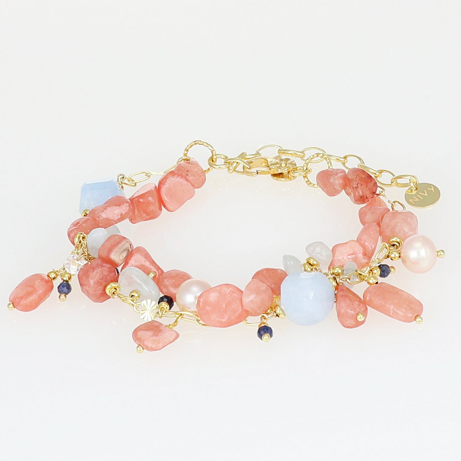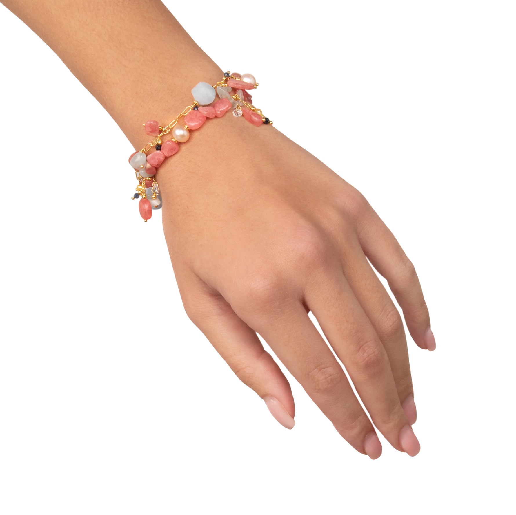 The Kaely double-strand bracelet is a creation of extraordinary refinement that celebrates the beauty of natural gemstones in a harmonious and enveloping design. Crafted on a base of gold-plated 925 silver, this accessory stands out for its multi-strand structure that gracefully combines the different textures of the materials, creating a play of volumes that is light yet visually striking. The color palette features the rosy and vibrant hues of rhodochrosite, interspersed with the ethereal clarity of aquamarine and the timeless purity of freshwater pearls, for a poetic and radiant look.