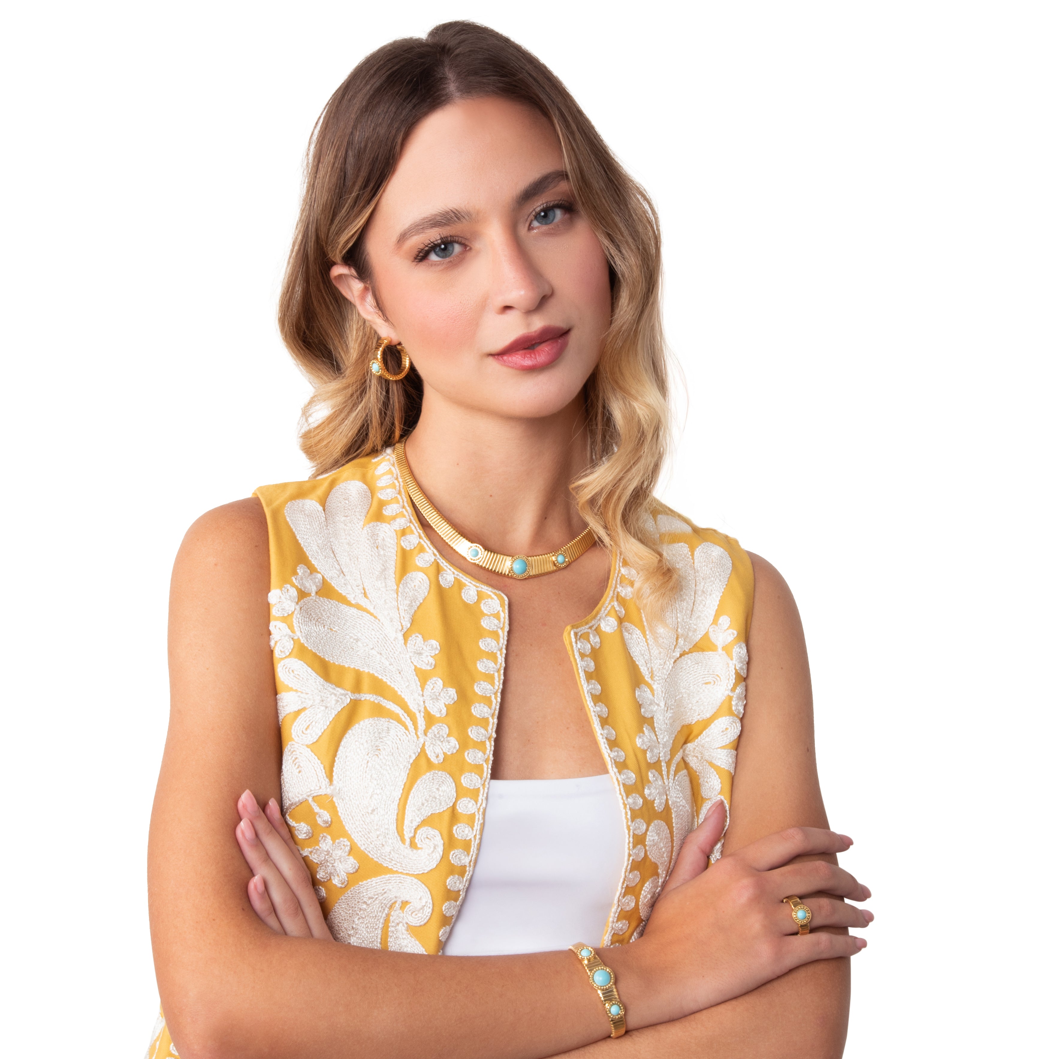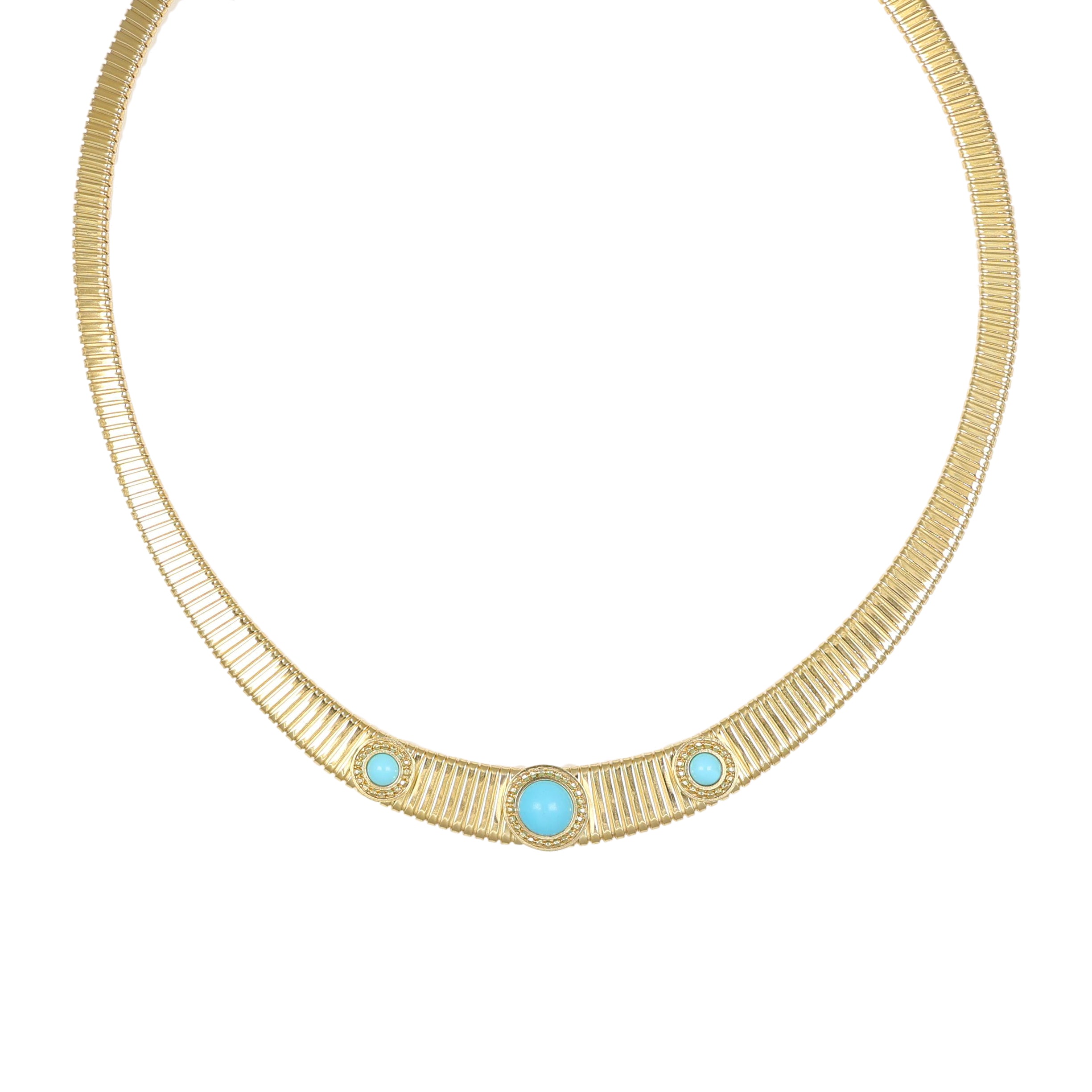 El punto focal del collar lo representan las tres bobinas centrales de pasta de turquesa. Cada piedra, de color azul vivo e intenso, está engastada en un marco circular finamente decorado, creando un contraste cromático perfecto con el oro de la base. El diseño simétrico y la estructura estriada del tubogas evocan un estilo vintage, reinterpretado en clave contemporánea.