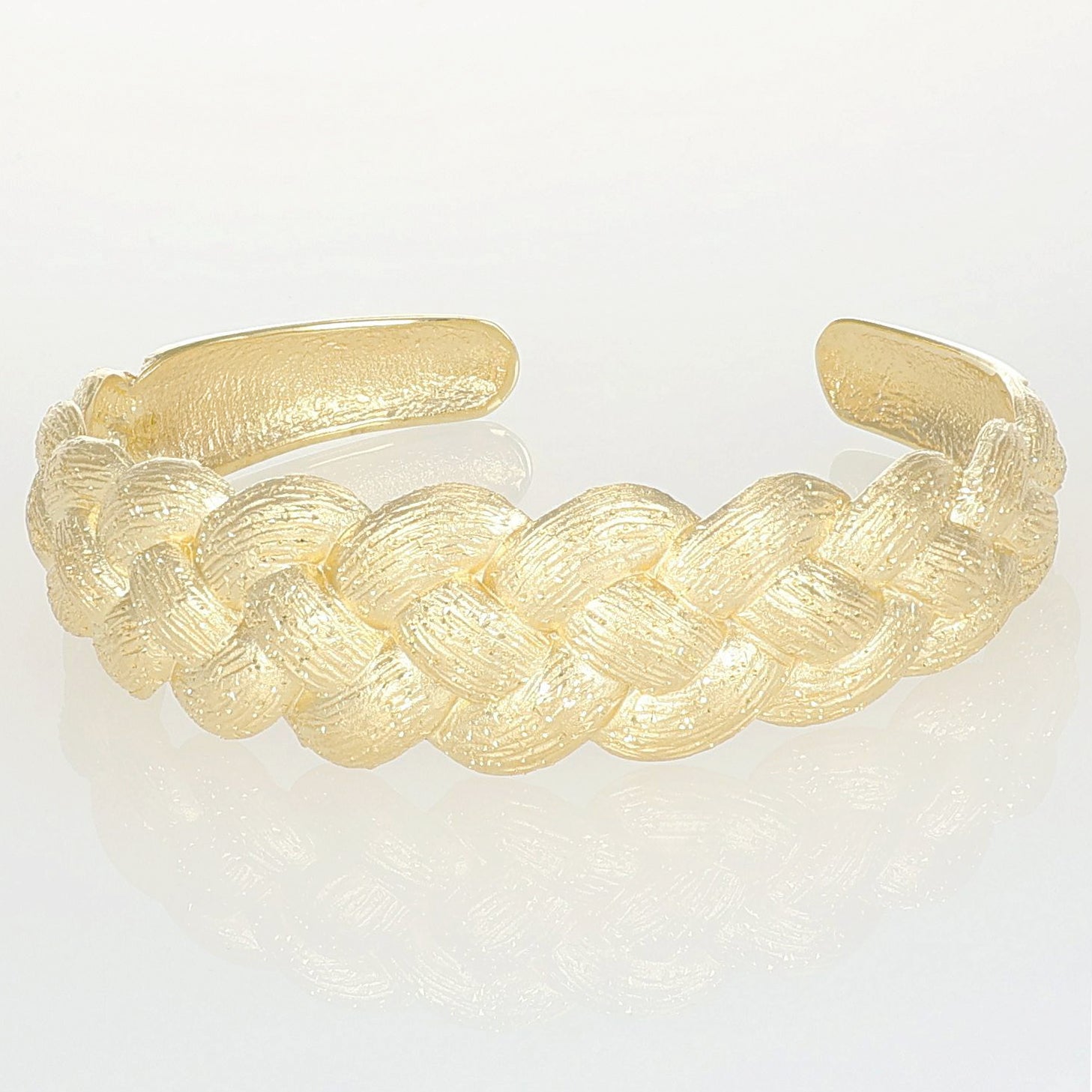 La pulsera presenta una estructura de trenza ancha, voluminosa y con textura, que envuelve el brazo con elegancia. El diseño abierto permite una vestibilidad práctica y moderna, convirtiéndolo en un accesorio "statement" capaz de definir por sí solo todo el conjunto.