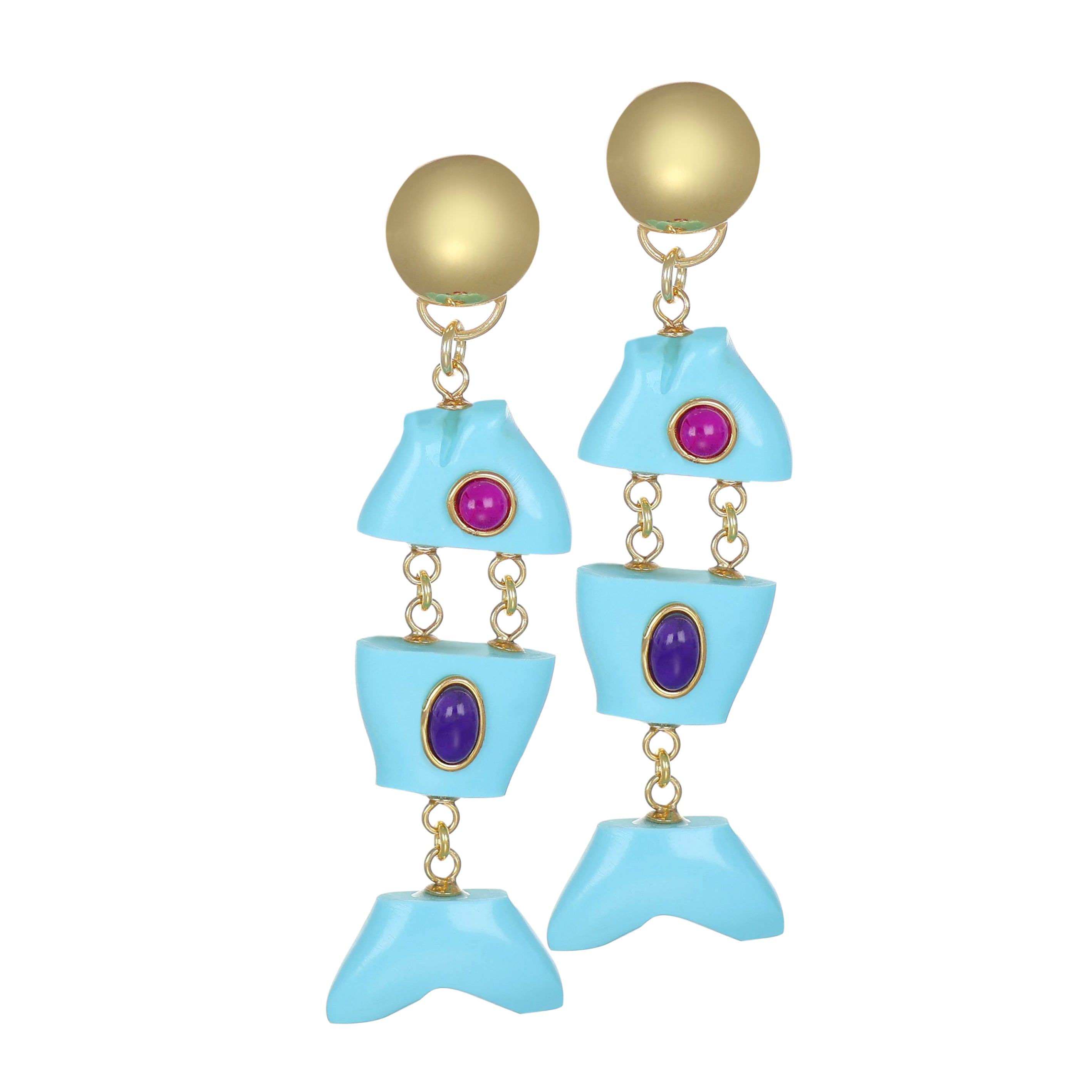 El corazón de estos pendientes es el cuerpo del pez, realizado completamente en pasta de turquesa. La estructura está dividida en tres secciones móviles, cabeza, cuerpo y cola, unidas entre sí por pequeños anillos dorados que permiten que la joya baile con cada movimiento.