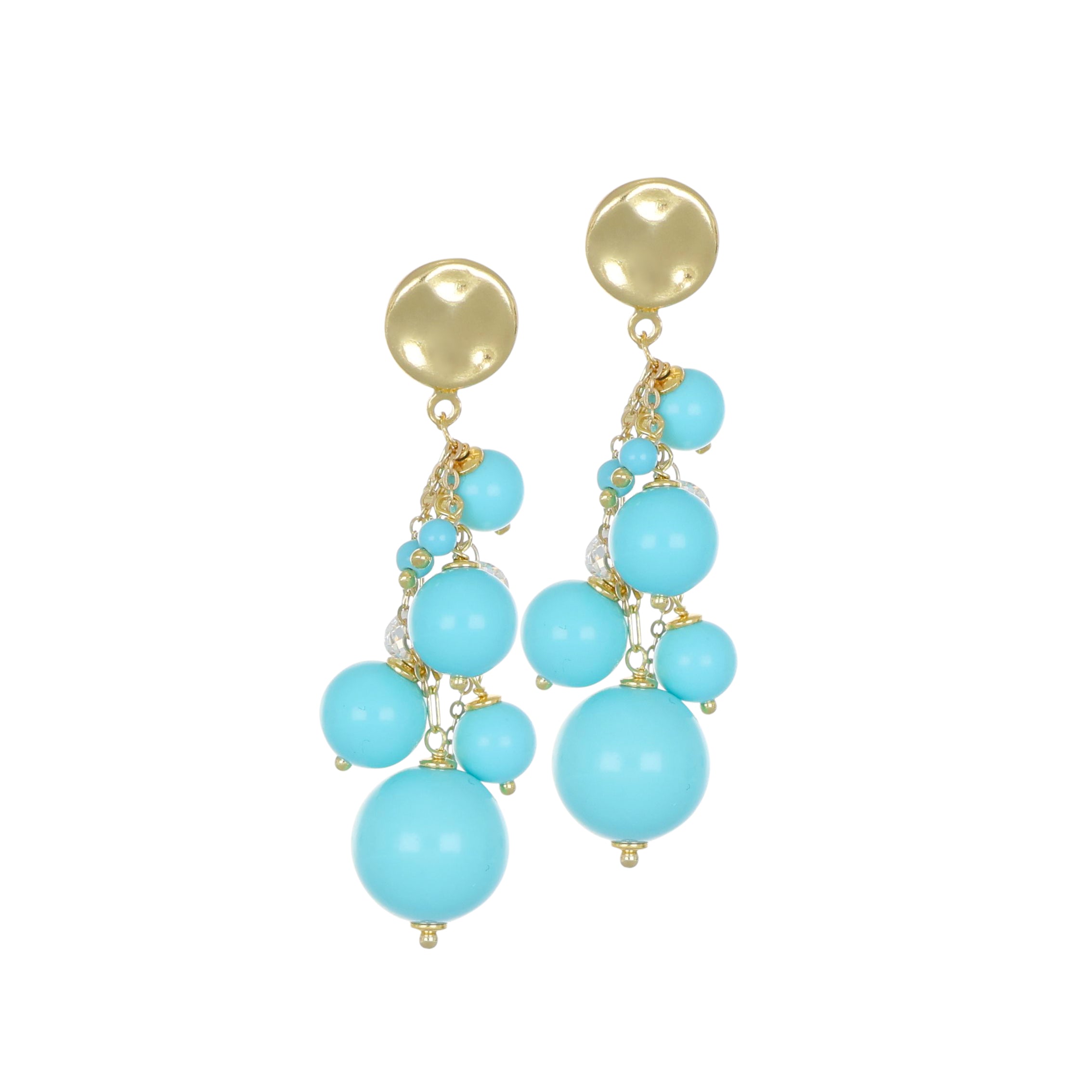Estos pendientes colgantes de plata 925 dorada encantan por su diseño escenográfico en cascada, capaz de evocar la frescura y la vivacidad de los colores mediterráneos. La joya comienza con un refinado cierre de tuerca circular, cuya superficie lisa y brillante crea un espejo de luz dorada en el rostro. De la base desciende un rico racimo de esferas de pasta de turquesa de diferentes tamaños, dispuestas de forma degradada para crear un efecto de volumen dinámico y natural. La composición se realza aún más con la inserción de pequeños circonios transparentes que aportan brillantes puntos de luz similares a gotas de agua iluminadas por el sol. Con una longitud de 5,5 cm, estos pendientes ofrecen un movimiento fluido y elegante, representando un accesorio de gran personalidad, ideal para realzar con un toque solar y elegante tanto los looks diarios como las ocasiones más especiales.