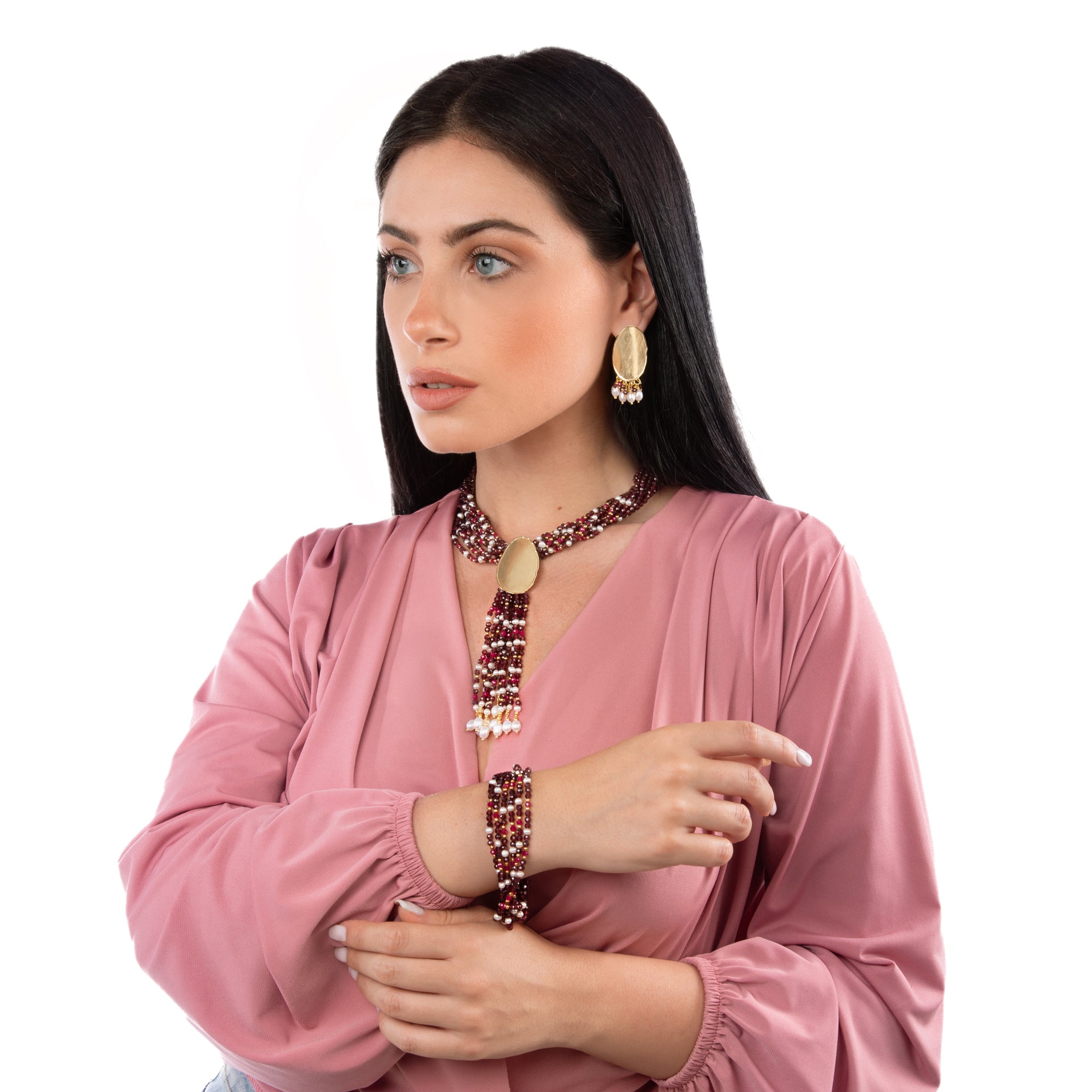 Los colores profundos e intensos del ágata rubí se fusionan con la pureza de las perlas de agua dulce. Esta combinación de materiales clásicos y preciosos garantiza una joya de alta calidad con un encanto atemporal.
